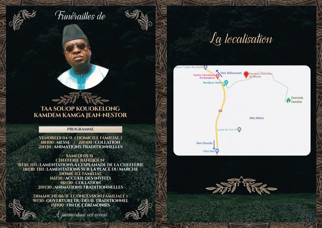 Malheureusement des restrictions dues à la pandémie n’ont pas rendue possible la célébration du Deuil traditionnel. La pandémie étant derrière nous, la famille Kamdem Kamga vous convie aux celebrations des funérailles qui se tiendront du 4 au 6 novembre prochain à Bandjoun.